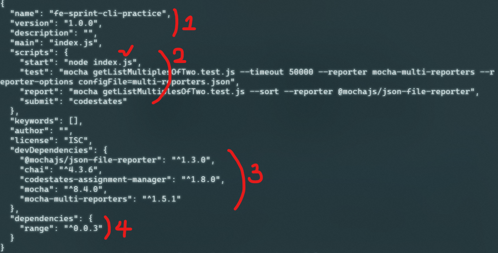 2. scripts영역 (예시로 npm run start 명령어를 입력시 node index.js 가 실행되도록 명시되어있다.) 3.devDependencies 영역 -- 실제 동작보다 테스트에 더 초점이 맞춰진 패키지들