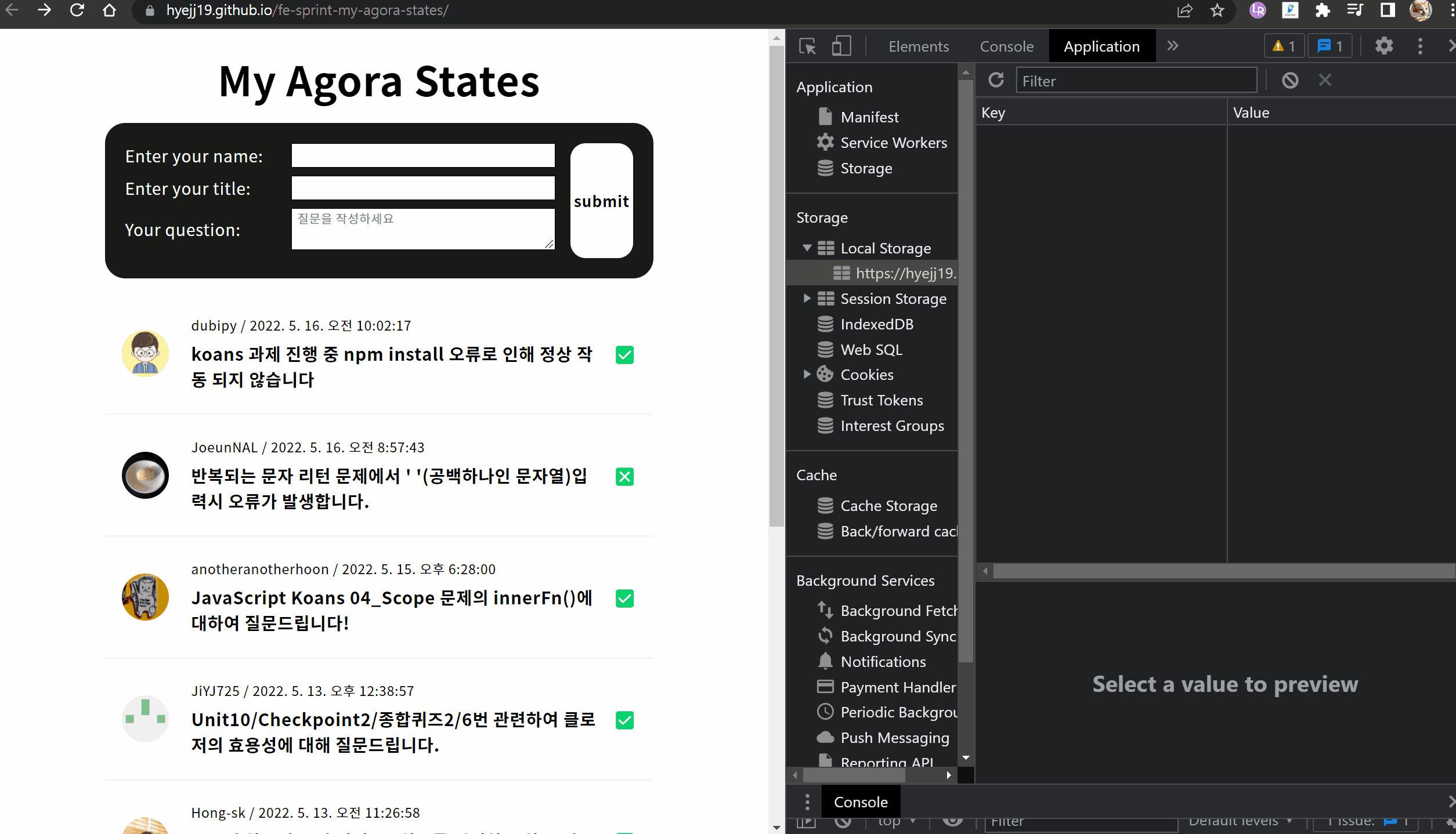 - 처음에는 로컬 스토리지에 저장되는 키 값을 배열의 인덱스로 하려고 했는데, 그러면 배열에 먼저 unshift로 저장을 하고 배열을 다시 불러와 렌더링을 해주어야 했다. 여기까지는 되었는데, 앞서 언급했듯 submit을 누르면 새로고침 이전에 작성한 데이터가 다시 날라가고 처음부터 쌓여버리니 뭔가 데이터 형식도 맞지 않고 코드가 어디선가 꼬였던 것 같다.