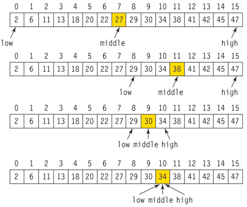 - while문 내에서 범위가 좁혀져서 low와 high가 만나는 순간까지 각 검색을 반복하면서 low 혹은 high를 mid 값을 기준으로 계속 변화시켜준다.