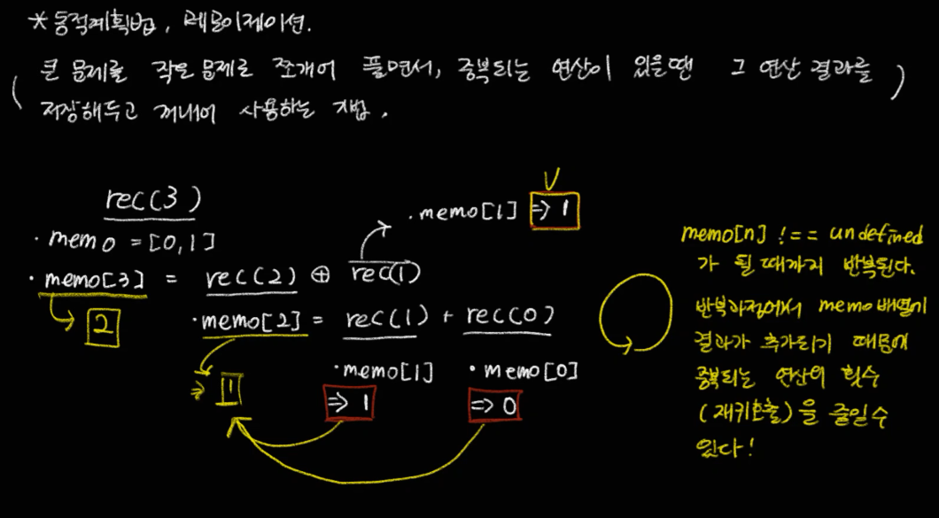오늘도 역시나 그렇듯 한번에 이해가 되지 않아서 그림으로 그려보았다. 일단 동적 계획법이란 큰 문제를 작은 문제로 쪼개서 푸는 기법인데 재귀와 약간 다른 점은 중복되는 연산이 있을 때 그 연산의 결과를 저장해두고, 연산을 하게 되면 그 결과값을 꺼내서 쓸 수 있다는 것이다. 이게 '한 번 풀었던 문제를 기억한다'의 의미이다. 이런 기법을 메모이제이션이라고 하고, 연산 횟수를 줄일 수 있는 최적화 기법이다. 지금 가만 생각해보면 한 번 있었던 일을 기억하는 것이 성능 최적화에 좋은 방법인 것 같다. 브라우저에서도 쿠키나 캐시같은 것을 사용하는 것 처럼...