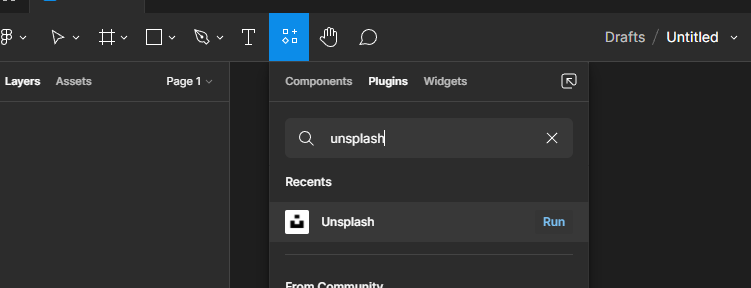 2. 두 번째는 figma에서 plugin을 적용하는 방법이었다. 유어클래스 강의자료에는 업데이트 된 내용이 반영되지 않았는데, 검색해도 자료가 잘 나오지 않아서 꽤 애를 먹었다. 업데이트 이전에는 community 탭에 들어가 설치할 plugin을 찾은 뒤 install을 해주어야 했는데, 이제는 저 ... 그림과 같은 버튼을 누르고 Plugins 탭을 누르면 바로 플러그인을 검색하여 사용할 수 있다. 별도의 설치가 필요한 것 같진 않았다! 오늘은 unsplash 플러그인을 유용하게 활용했다.