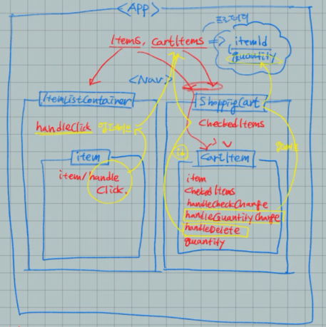 알아보기 힘들긴 하지만... 간단하게 이런 식으로 도식화(?) 를 해봤는데 다시 리뷰를 해보자면... 먼저 App.js 안에 ItemsListContainer 컴포넌트와 ShoppingCart 컴포넌트가 존재한다. 이 최상단 컴포넌트 안에서 items와 cartItems 라는 상태를 관리하고 있는데, 상태와 상태 변경 함수를 각각의 컴포넌트에 props 로 내려주어 상태 끌어올리기로 변경시켜주어야 함.