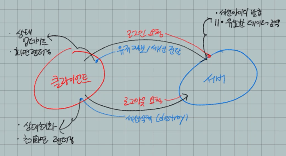 상당부분 간소화를 했지만... 세션 id를 주고받으면서 (만약 유효한 세션id가 브라우저에 있다면) 요청과 함께 보내서 기존 상태에 해당하는 데이터를 받을 것이고, 아니라면 로그인과 동시에 세션 id를 발급 받을 것이다.
