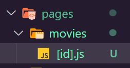 react-router-dom 에서 파라미터를 받을 때 path = '/:category'와 같이 작성해 주었던 것 처럼 Next.js 도 파라미터를 통해 라우팅을 할 수 있도록 지정해줄 수 있다. 위 방법으로 만든 all.js 를 통해 movie/all 과 같이 접근할 수 있다면 아래와 같은 방법으로는 movies/123 과 같이 id를 변수로 하여 접근할 수 있음.