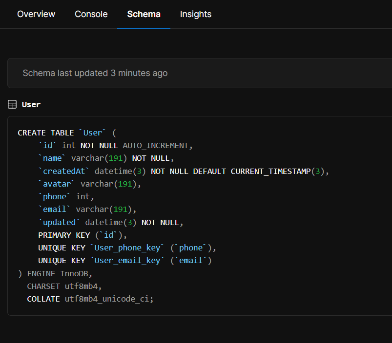 - planet scale 의 db > schema 탭에 가서 확인해보면 우리가 정의한대로 잘 push 된 것을 볼 수 있다.