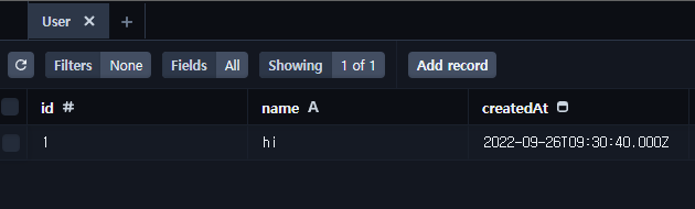 - 브라우저에서 API 주소로 간 뒤 새로고침 후, prisma studio 를 살펴보면 아래와 같이 데이터가 추가된 것을 확인할 수 있다.