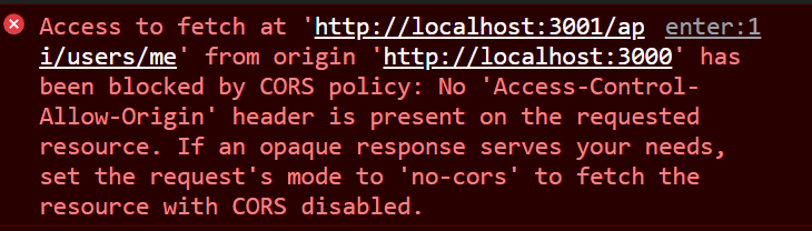 개발 단계에서 서버의 url 이 localhost:30001/api/users/me 인데 요청을 하는 브라우저의 url 이 localhost:3000 이기 때문에 CORS 정책에 위반되어 블락한다는 에러메시지가 출력되었다.