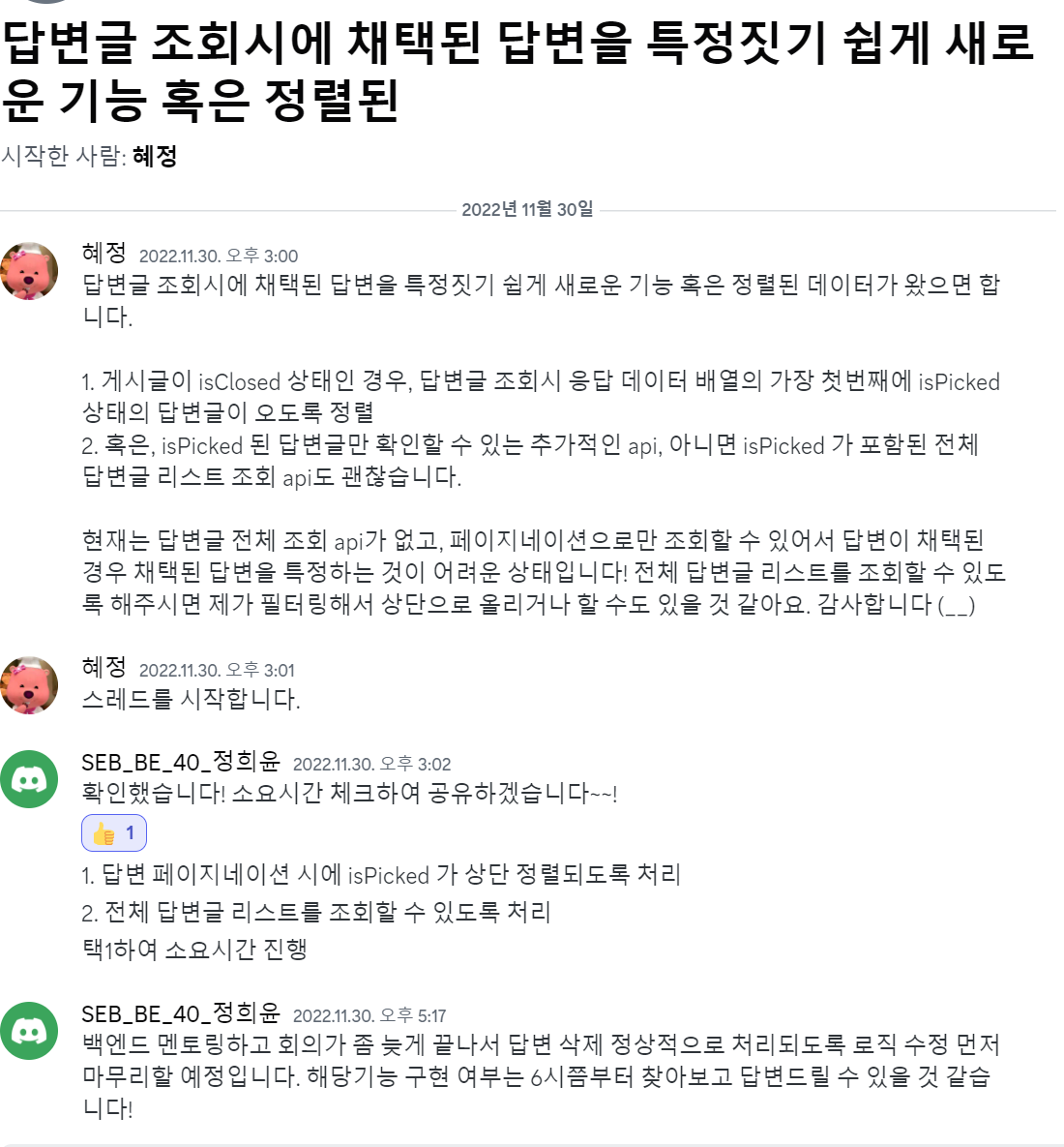 코멘트 작성 기능을 완성했고, 답변 등록시 에러가 생기는 부분들을 지속적으로 테스트하면서 찾아냈다. ui 적으로도 미처 신경을 쓰지 못했던 부분들이 많아서 계속 수정을 하면서 테스트를 했다. 생각보다 백엔드쪽 로직에서 오류가 발생하는 부분도 많아서 테스트하면서 해당 상황에 대해 에러코드와 함께 전달드리면서 소통했다. 새로운 api가 필요하거나 문의사항이 있을 경우에는 디스코드 스레드 기능을 적극 활용했다. (스레드 기능을 제안해주신 씨앗님께 무한감사...)