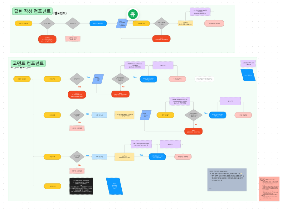 위와 같이 한 페이지 내에서 주요 기능을 담당하는 컴포넌트를 분리한 다음에, 각 컴포넌트가 어떻게 동작해야 하는지 데이터는 어느 시점에 어떻게 업데이트가 되어야 하는지 플로우차트를 그려가면서 정리하려고 노력을 많이 했다. 그 때는 mutate 라는 함수의 동작 방식에 대한 이해가 부족했기 때문에, mutate 함수에 url 만 전달하면 특정 시점에 알아서 조회하여 데이터를 업데이트 하도록 할 수 있다는 것을 몰랐다.
