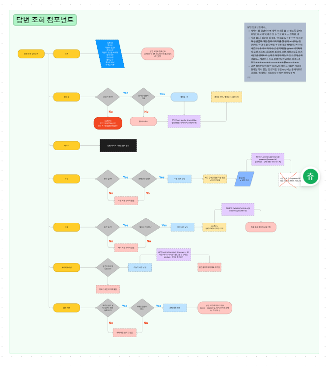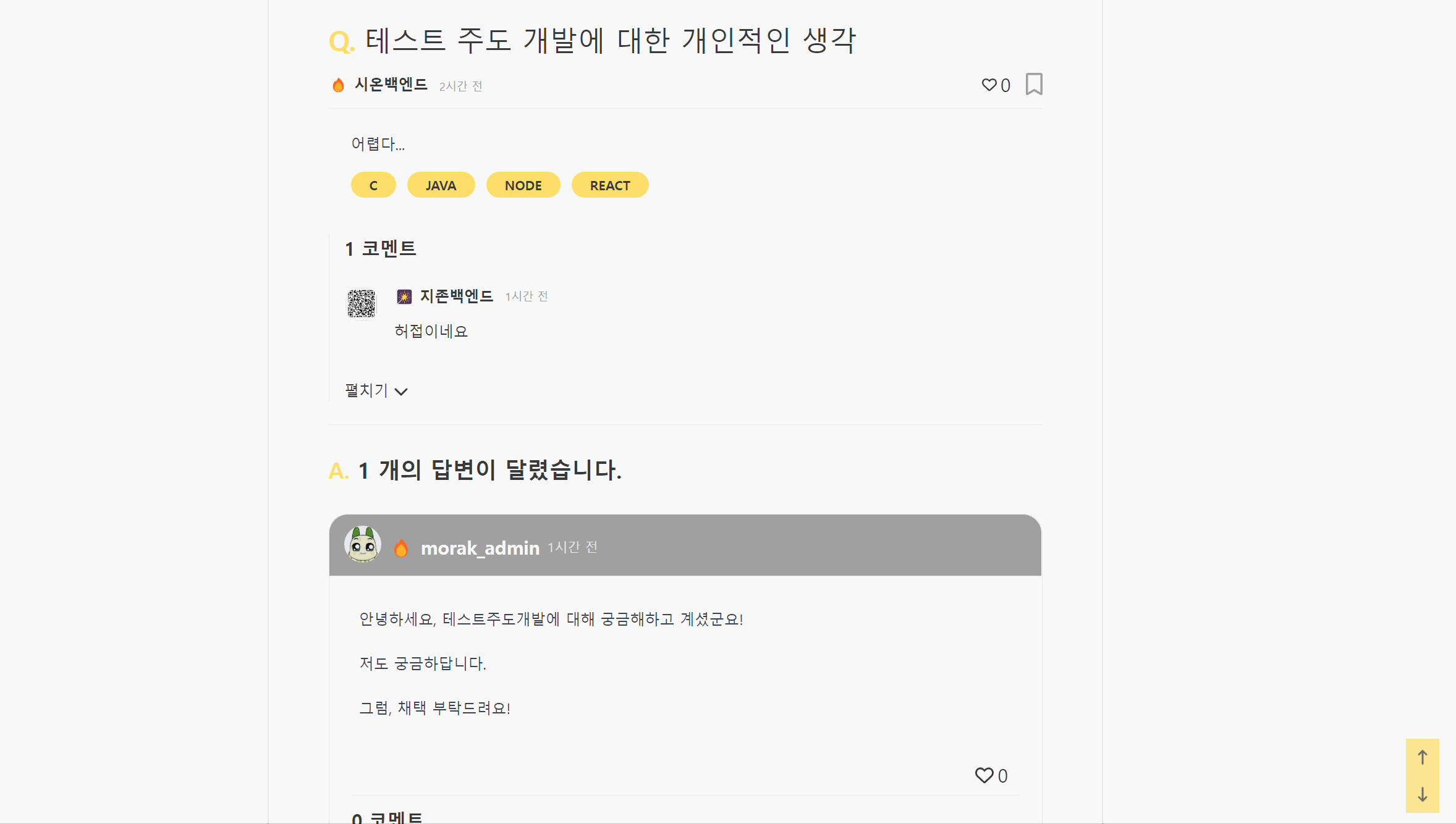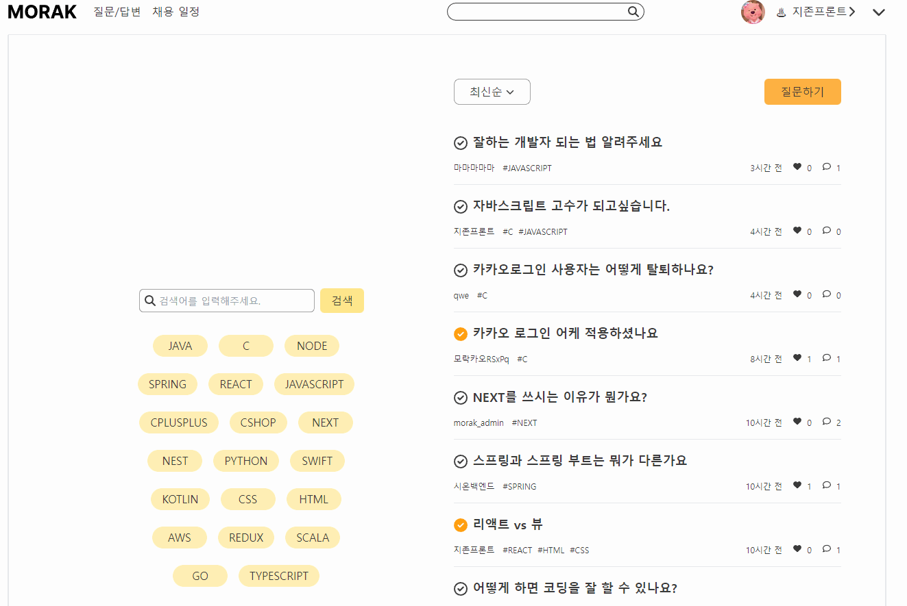 1. 프론트엔드 개발자 1로(ㅋㅋ) 게시글 리스트와 상세페이지, 답변, 코멘트 등 CRUD 로직 및 채택기능을 담당했다.