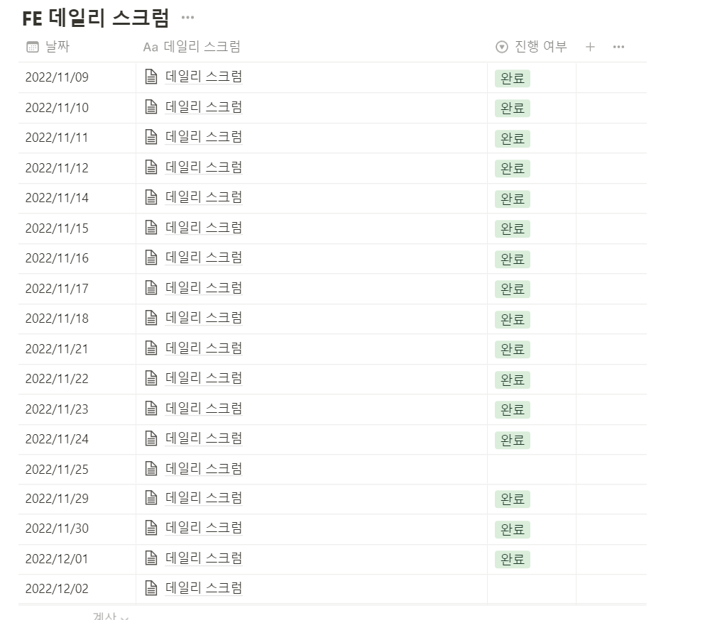 처음에는 데일리 스크럼이라는 개념이 없이 주 2회 만나서 회고를 하자고 하셨었는데, 나중에는 데일리 스크럼을 하자는 의견이 받아들여져서 하루 30분이나마 서로 얼굴을 보고 얘기할 수 있는 기회가 생겼다. 이게 자리를 잡은건 프로젝트 중반 쯤이었던 것 같은데 나는 그 때 이 의견이 받아들여져서 데일리 스크럼을 시작할 수 있었던게 너무 다행이라고 생각한다.