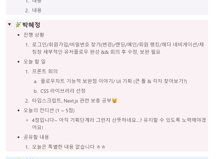 - 프론트끼리는 오전 11시에 모여 세부적인 진행사항과 컨디션 등을 체크했다.
