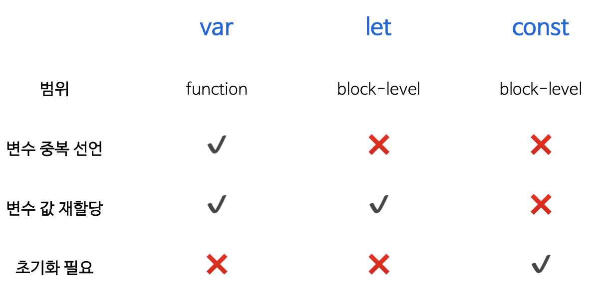 if문에서 var 로 변수를 선언하면, 블록스코프인 조건문이나 반복문이 종료가 되어도 해당 변수는 여전히 남아있게 됩니다.