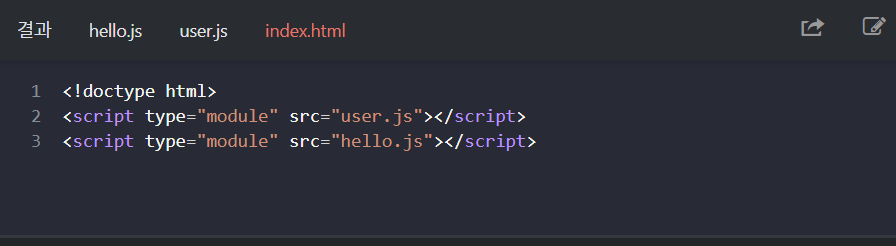 그리고 이를 활용하려면 아래와 같이 script 태그 내부에 ‘이 자바스크립트 파일은 모듈 방식으로 동작합니다’ 라고 명시해주어야 합니다.