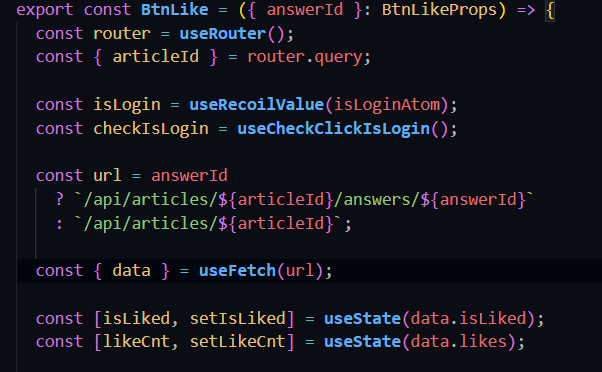 이 컴포넌트는 좋아요를 표시하고, 요청을 보낼 수 있는 버튼이다. 기존에는 isLiked, likes 처럼 렌더링에 필요한 데이터를 굳이 부모 컴포넌트에서 props로 내려주고 있었는데, 현재는 이 컴포넌트에서 바로 얻을 수 없는 데이터인 answerId 항목에 대해서만 내려주고 있다. (왜냐면 버튼이 article에 달린 경우가 있고, answer 에 달린 경우가 있어서 필요하다.)