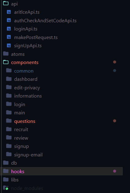 아무튼 지금까지 해온 작업은, 프로젝트 폴더 구조 뜯어 고치기. 정말 부끄럽게도 기존에 확장에 대한 생각 없이 개발자별로 폴더를 나눠 각자의 작업물을 분류했었다. 하지만 리팩토링을 시작하고 니꺼내꺼 구분이 없는데 그런 구조는 복잡성만 높이고 들여다보기 싫어지는 코드가 되는 원인이라고 생각해서, 뜯어고치자고 제안을 드렸다. 시간으로만 따지면 거의 6시간 정도 걸린 것 같다. 규모가 작으니 다행이지....