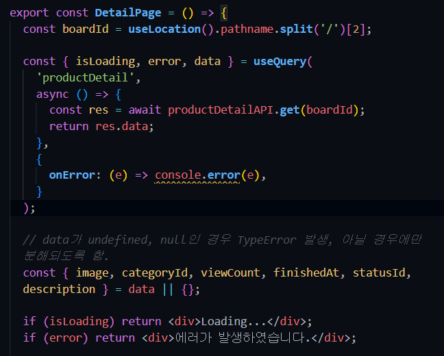 2. react-query를 적용해 서버로부터 데이터를 가져와봤다. 공식 문서에 있던 예제코드를 참고해 아래와 같이 요청 로직을 작성. data를 분해해서 렌더링에 활용하려고 하니, undefined 이거나 null인 경우 TypeError가 발생했다. 그래서 data가 유효한 경우에만 분해할 수 있도록 OR 연산자를 사용했다.