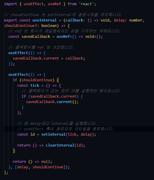 조건을 입력하면 콜백함수를 delay시간동안 반복 실행시켜주는 useInterval 훅을 리팩토링함. 의존성 배열에 shouldContinue를 넣어줌으로써 shouldContinue의 상태가 변하거나 컴포넌트가 언마운트 될 때 클린업하는 함수를 실행한다. useEffect에서 리턴하는 함수는 컴포넌트 언마운트시에 실행되는 cleanUp함수이다. (공식문서 참고)