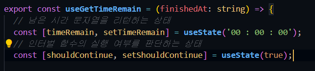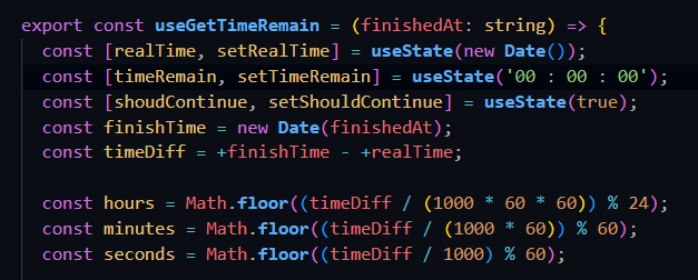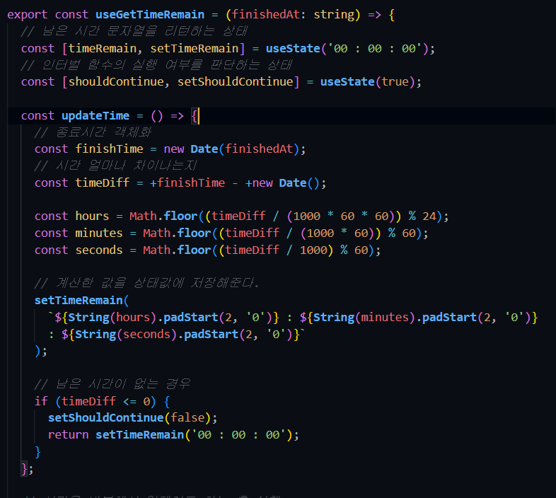 이 useGetTimeRemain이라는 훅은 아래와 같이 생겼다. 먼저 현재 시간을 상태값으로 관리하고, finishedAt - realTime 을 한 timeRemain을 상태값으로 관리하고 있다. timeRemain이 state이기 때문에, 실시간으로 변경하면 화면에 그대로 렌더링이 된다.