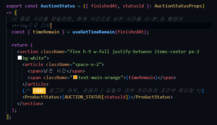 먼저 타이머 함수가 적용되고 있는 컴포넌트 함수는 아래와 같다. useGetTimeRemain이라는 훅에 종료시간을 전달해서 timeRemain이라는 값을 가져오고 있다. 그 값을 그대로 렌더링하고 있다.