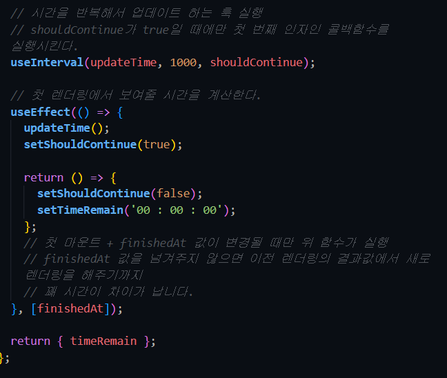먼저 기존과 동일하게 time 과 shouldCountinue는 상태값으로 등록해주었다. 다른 함수 내에서 이 값을 업데이트할 필요가 있었기 때문이다. 그리고 useInterval 훅을 통해 시간을 업데이트하고 카운트를 해주는 updateTime 이라는 함수를 만들었다. 그냥 기존에 useInterval로 넘겨주던 훅을 함수화 했다고 보면 된다.