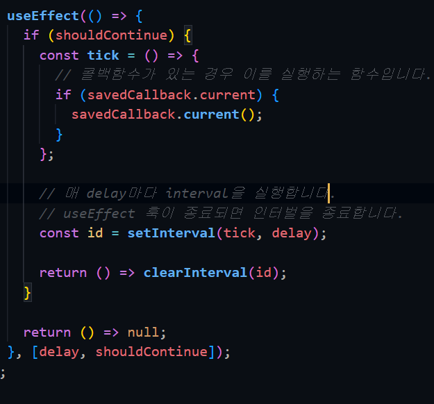 일단 Interval 훅 자체에는 큰 문제가 없는것으로 생각이 된다. 조건을 확인하여 해당 조건에 부합할때만 interval이 실행이 되고, 또 컴포넌트가 언마운트 되는 경우 해제도 되고 있다.