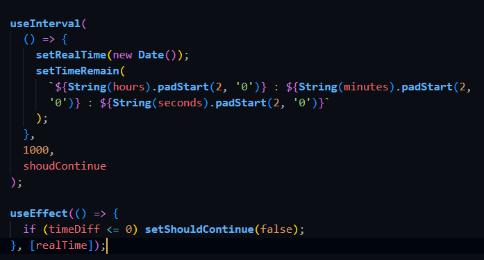 여기서 또 useInterval이라는 훅을 호출해서, realTime을 1000밀리세컨드에 한 번씩 새롭게 업데이트하고 그에 따라 timeRemain도 변경한다. realTime을 주시하다가 남은 시간이 0이하로 내려가면, 인터벌을 종료하도록한다.