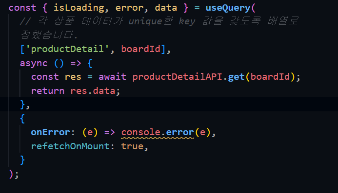 2. react-query 에서 존재하지 않는 페이지임에도 이전 페이지를 캐싱했다가 띄워주는 문제가 있었다. react-query 에서는 key 값이 변하지 않는 이상 일단 이전 캐싱 데이터를 보내준다고 함. 상세페이지의 경우 모든 페이지가 각각 다 다르기 때문에 key 값을 페이지별로 다르게 지정할 필요가 있음. 원래는 key값을 문자열로 설정해두었는데, 이 key 값을 설정하는 것에 대해서도 컨벤션이 필요할 것 같다. 왜냐면 전체 앱에서 유니크한 값이어야 하기 때문에 동적으로 변하는 boardId를 추가해주기 위해서다.