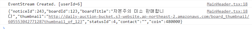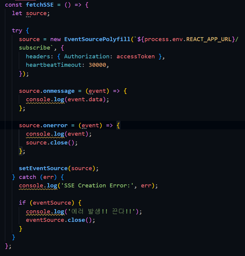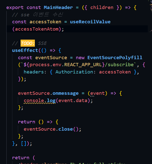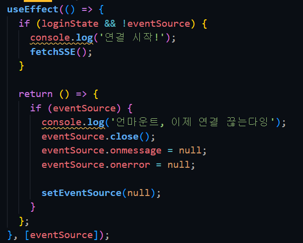 알림 데이터 수신을 위해 아래와 같이 SSE 연결 코드를 작성했다.