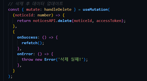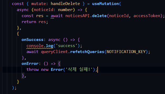 위와 같이 api를 호출하고 성공시 업데이트 하도록 메서드를 사용해주었다. 그런데 이상하게 한 박자 늦게 삭제되는 것이다. 흠.. 뭘까. 일단 쿼리 데이터에 대한 수정,삭제이기 때문에 useMutation 훅을 사용하는것으로 변경해주었다. 코드는 아래와 같다. 그런데도 마찬가지로 삭제가 되지 않는다 음....