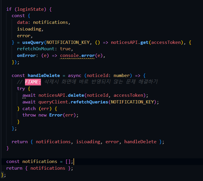 이를 수정하기 위한 방법은 useNotification에서 가져오는 notifications 데이터를 useQuery를 사용해서 가져와야 한다. 전체 알림을 조회하는 API가 있으면, 먼저 useQuery로 해당 데이터를 가져오고, setQueryData로 쿼리데이터를 직접 업데이트 하게 된다.
