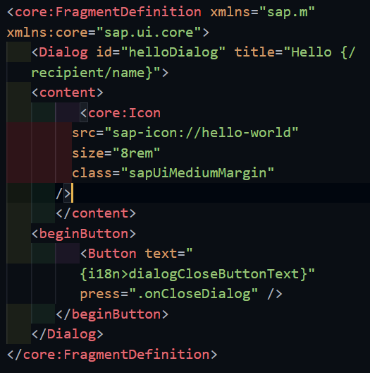 10. Fragment란 SAPUI5 에서 UI 블록을 재사용 가능한 코드 단위로 묶어서 관리하는 개념이다. 각각의 Fragment 는 모듈로 작성되어서 분리가 됨. 아래는 Dialog Fragment를 만드는 예시 코드이다.