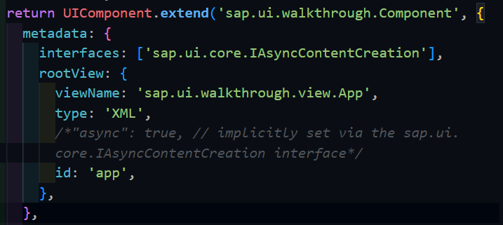 7. component 를 정의해 컨트롤러와 분리시킨다. 아래와 같이 UIComponent 생성자 함수를 불러오고 여기서 metadata 항목을 이용해 view를 바인딩한다.