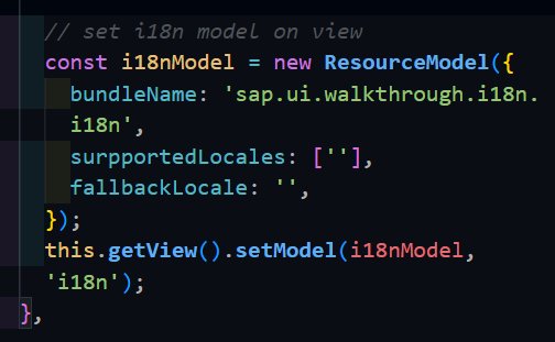 이런식으로 컨트롤러 메서드에 가져와서 적용할 수 있다. 번들이라는게 아까 만든 i18n모델의 리소스 번들이고, 여기서 값을 가져와 화면에 띄워줄 수 있도록 함. 뭔가 getView에 getModel 에 get으로 시작하는게 많다.