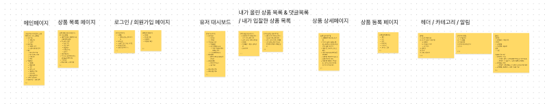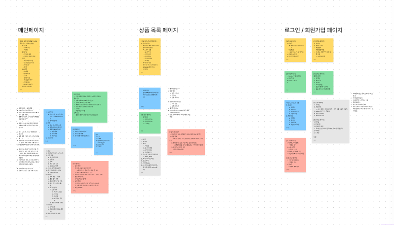 위와 같이 각 페이지별로 필요한 내용에 대해서 서로 생각하는 바를 정리하고, 이를 취합해서 한 페이지에 어떤 컴포넌트, 어떤 데이터가 들어가야 할 지 논의를 했다.