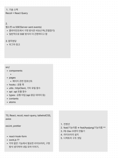 시작하기에 앞서서 프론트 쪽에서는 어떤 기능을 어떤 기술을 써서 구현할건지 결정하고, 컨벤션과 개발 협업시에 필요한 내용을 논의하면서 프로젝트를 셋팅했다.