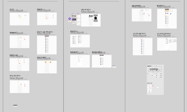 그 뒤 피그마를 통해 와이어 프레임을 만들었는데, 이 과정도 그냥 백엔드 분들과 함께 만들었다. 아래와 같이 디테일은 생략된 대략적인 와이어 프레임을 만들었는데, 모바일 기반으로 만들게 되어서 UI 적으로는 조금 간단하게 만들었다.