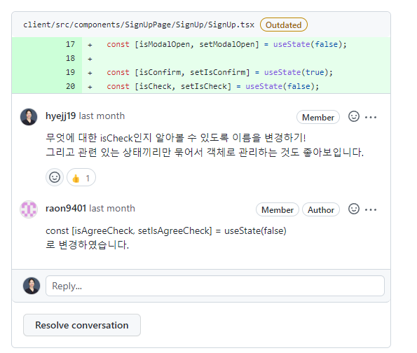 사실 다른 사람의 코드를 읽고 이해하는게 한 번에 될 만큼 쉽지는 않았는데, 다양하게 자주 소통하면서 서로 궁금한 점에 대해서도 묻고 답하고, 더 좋은 방법이 무엇이 있을까 고민하면서 함께 성장할 수 있었다고 생각한다. 이번에 프로젝트를 얼추 마무리 하고, 서로 구현했던 기능에 대해 설명하는 시간도 갖기로 했다.