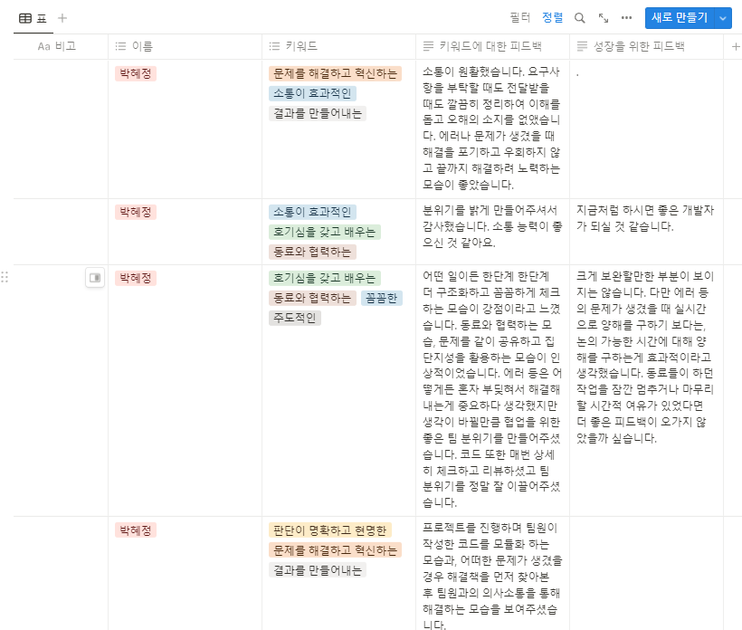 프로젝트 마무리 후 구글 폼을 만들어 동료 설문을 진행했다. 서로 강점에 대한 키워드를 뽑고 성장을 위한 피드백을 주고받았다. 나같은 경우 소통에 대한 긍정적인 면과 아쉬운 점이 두드러지는 것 같다. 이번 프로젝트에서는 동료들과의 소통도, 코딩도 어떻게 하면 효율적으로 할 수 있을까 고민을 많이 했는데 그런 고민과 행동이 유효하게 적용된 것 같아 다행이다.