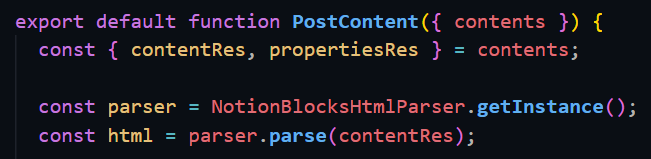나는 노션에서 제공하고 있는 클라이언트 대신에 직접 데이터를 요청해서 콘텐츠 blocks 를 받아오고 있기 때문에, 코드를 아래와 같이 작성해서 적용 수 있었다.