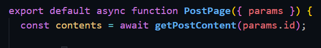 대신 새롭게 알게된 사실은 Page 컴포넌트에서 params 라는 객체로 현재 컨텍스트를 읽어올 수 있다는 것이고, 이를 이용해 useRouter 없이 서버 컴포넌트에서도 Link 태그로 전달하고 있던 id 값을 조회해 올 수 있었다.