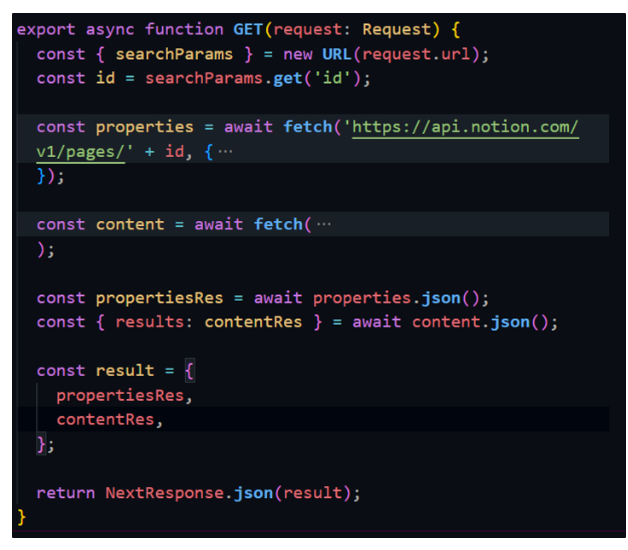 Notion API의 특성상 글 하나에 properties 와 content(blocks) 가 나뉘어 있기 때문에 api 문서를 참고해 요청을 보내는 코드를 만들었고, 이 응답값을 클라이언트에 보내주도록 작성했다. 그런데 지금 이 코드를 보면 요청 실패에 대한 처리가 하나도 안되어있어서 보완이 필요할 것 같다.