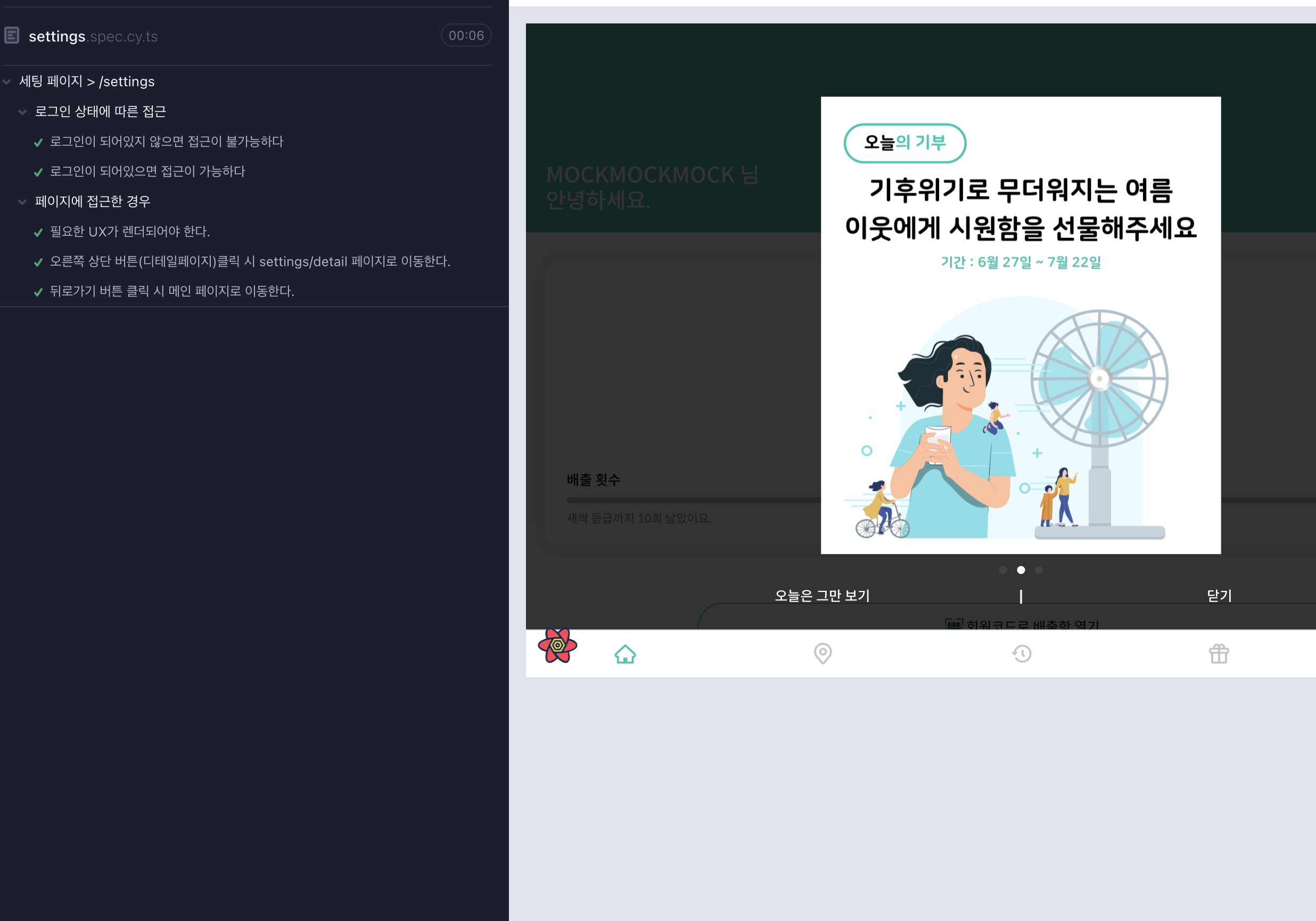 cypress 를 선택한 이유는 가장 범용적인 프론트엔드 e2e 테스트 라이브러이기도 하고, 또 기존에 몇몇 서비스 로직은 이미 cypress 를 활용해 작성이 된 바가 있어서이다.