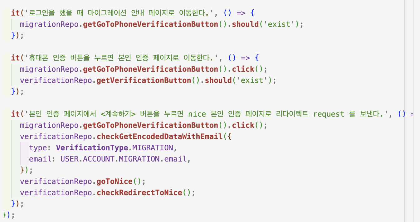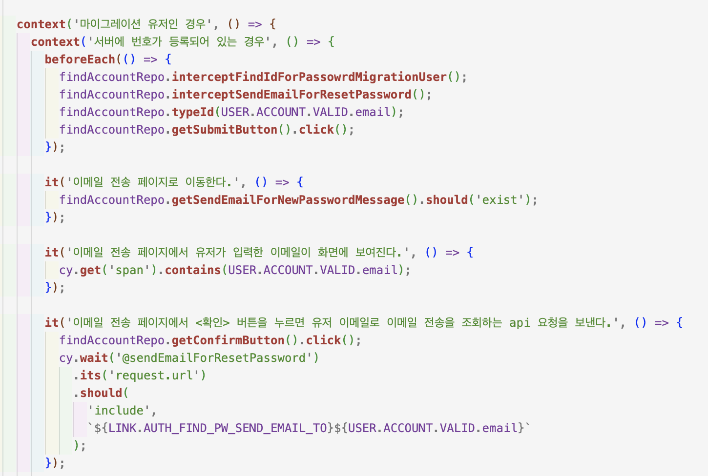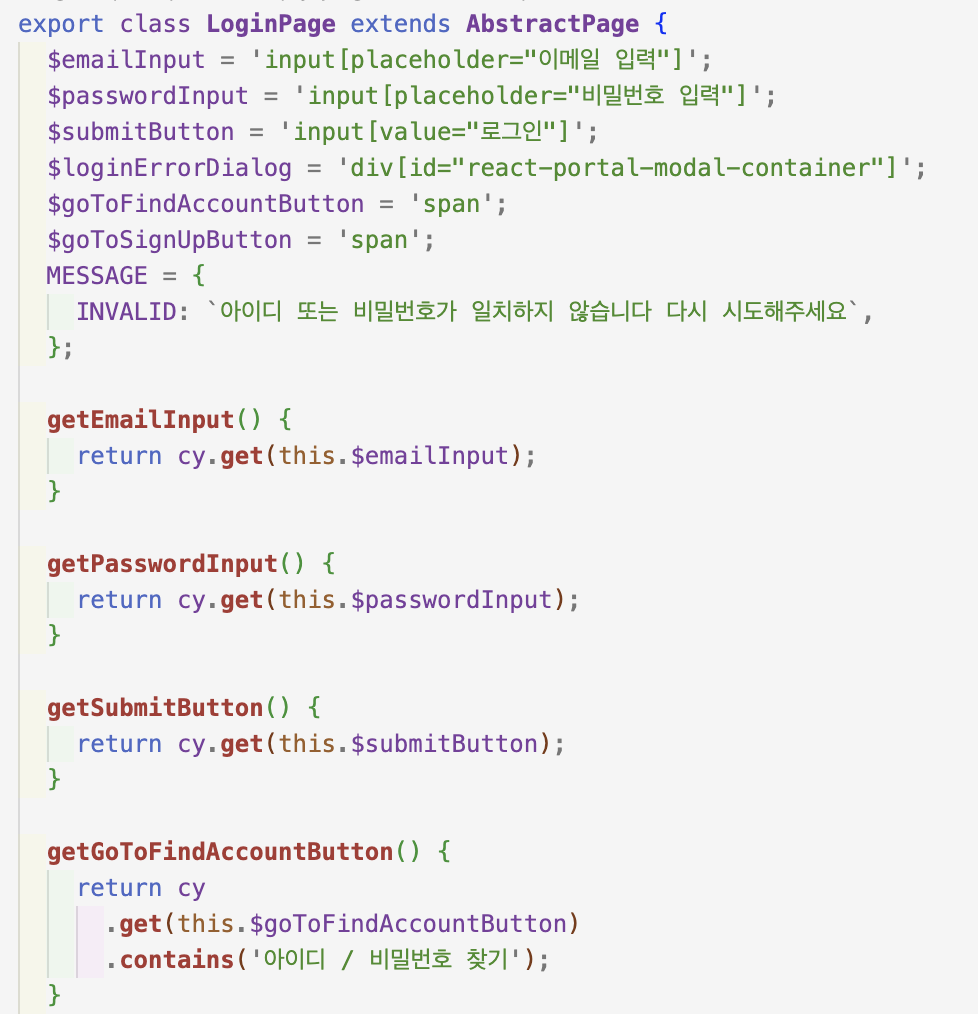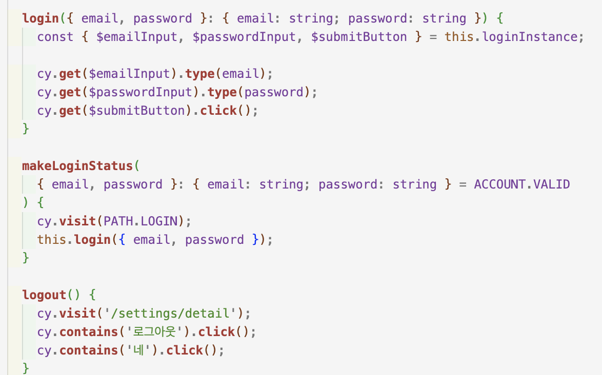 - 테스트에 필요한 액션이 클래스의 메서드로 관리되기 때문에, 실제로 테스트를 하는 spec.cy.ts 파일에서는 이 클래스로 인스턴스를 만들고 필요한 액션을 호출해 테스트를 진행할 수 있다.