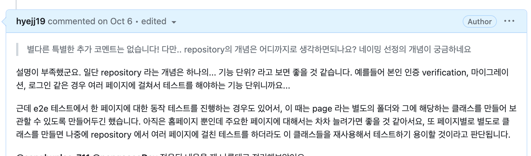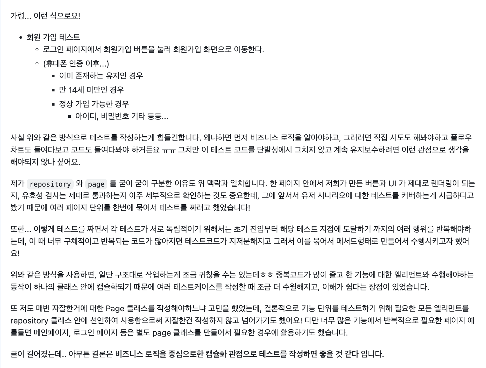 처음엔 내가 도입했지만 팀원들과 의견을 조율하며 편하고 관리하기 쉬운 방향으로 변화하고 있고, 현재도 이 구조를 기반으로 많은 e2e 테스트가 작성되었다. 리팩토링에 대한 부담도 줄어들었지만, 테스트 로직을 작성하며 우리 서비스에 대한 이해도도 높일 수 있었던 중요한 경험이었다. 서비스가 어떻게 돌아가는지 알아야 무엇이 문제인지, 어떻게 고쳐야 할지 결론적으로는 일을 잘 하는 방향으로 나아갈 수 있기 때문이다.